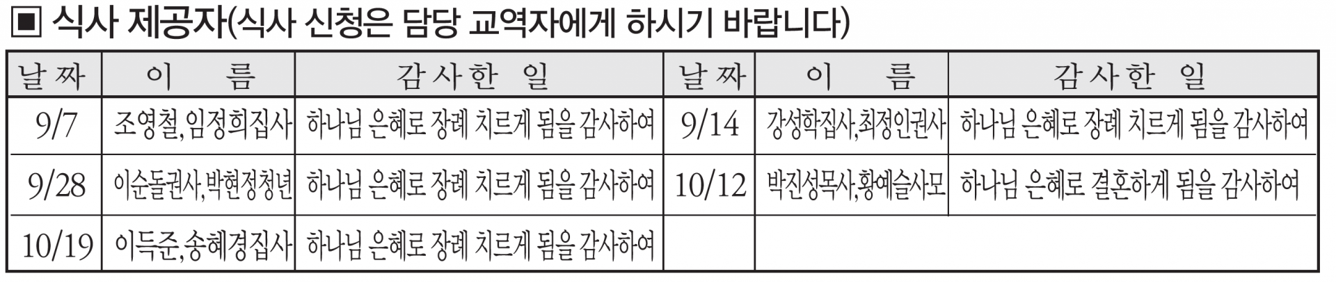 9월 주일 식사 제공자 - 감사합니다.
